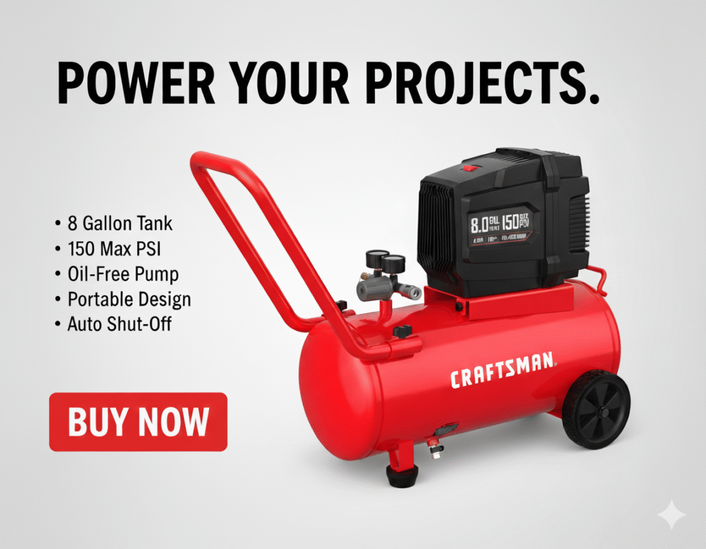 - A small 6–8 gallon tank is fine for light projects like brad nailing or inflating.